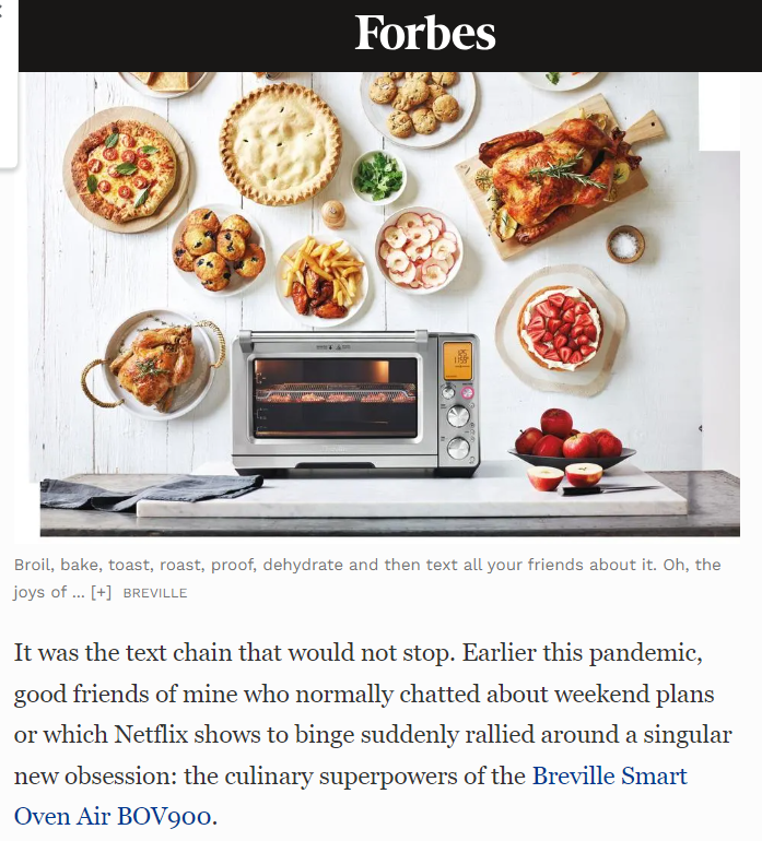 “Why Cooks Are Texting, Tweeting And Raving About Breville’s Smart Oven Air? It was the text chain that would not stop. Earlier this pandemic, good friends of mine who normally chatted about weekend plans or which Netflix shows to binge suddenly rallied around a singular new obsession: the culinary superpowers of the Breville Smart Oven Air BOV900.